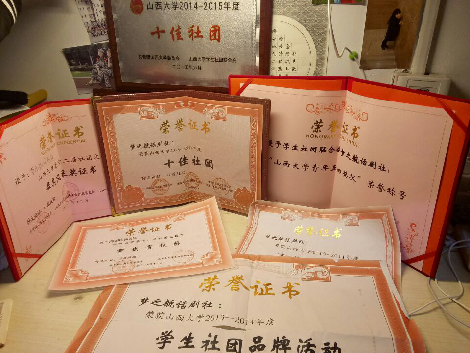 每年蝉联山西大学“十佳社团”称号,荣获2013-2014年度“学生社团品牌活动”,2015-2016年度“学生社团品牌活动”、2016年“山西大学青年五四奖状”荣誉称号、山西大学第十一届社团文化节“突出贡献奖”、2016年12月山西大学第十二届社团文化节“最具风采奖”,2017年山西大学十佳社团、 最具风采奖、学生社团品牌活动、优秀团支部等等。