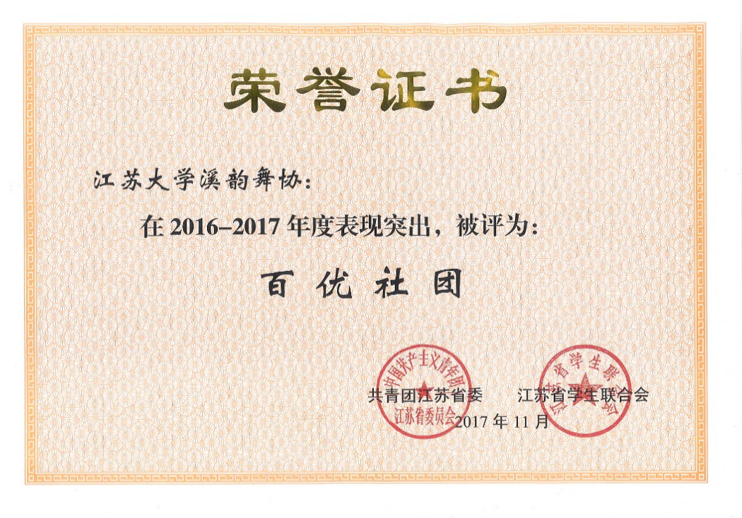 2017年溪韵舞协被江苏省评选为“江苏省百优社团” |