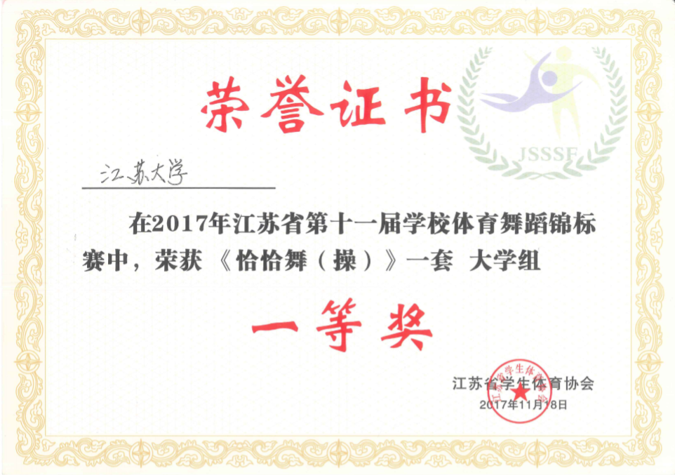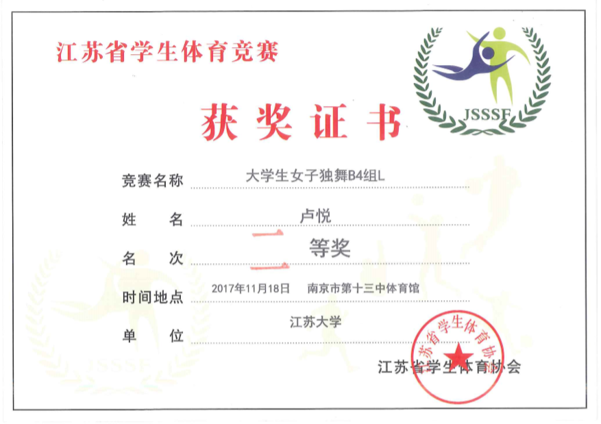 大学组团体恰恰操一等奖 大学生女子独舞二等奖2项 大学生双人舞第三名2项 大学生双人舞第五名4人 大学生双人舞第6名4人 大学生双人舞第7名2人 大学生双人舞第8名2人 |