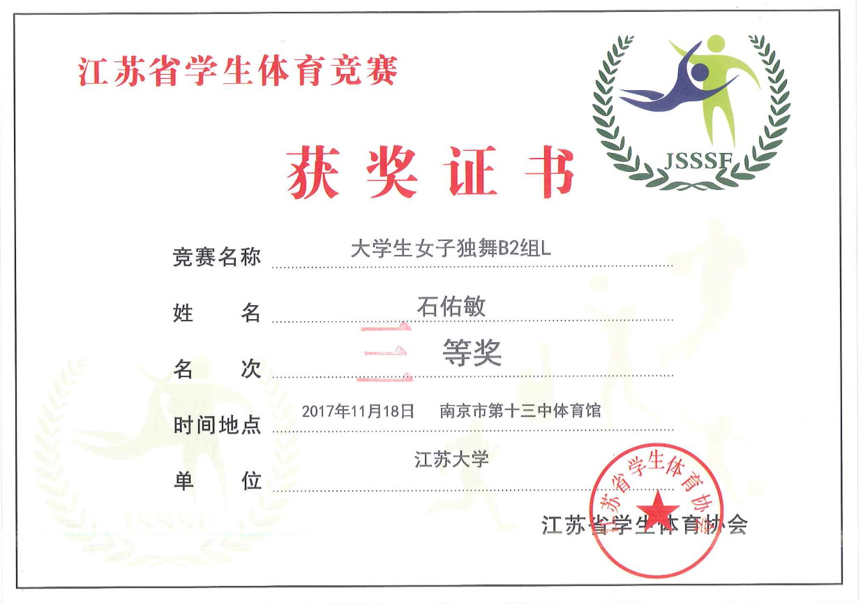 大学生单项伦巴三等奖2项 大学生单项牛仔三等奖2项 大学生单项恰恰三等奖4项 大学生女子单人A2组三等奖 大学生女子单人B2组三等奖 大学生女子单人伦巴三等奖 团体总分三等奖 |