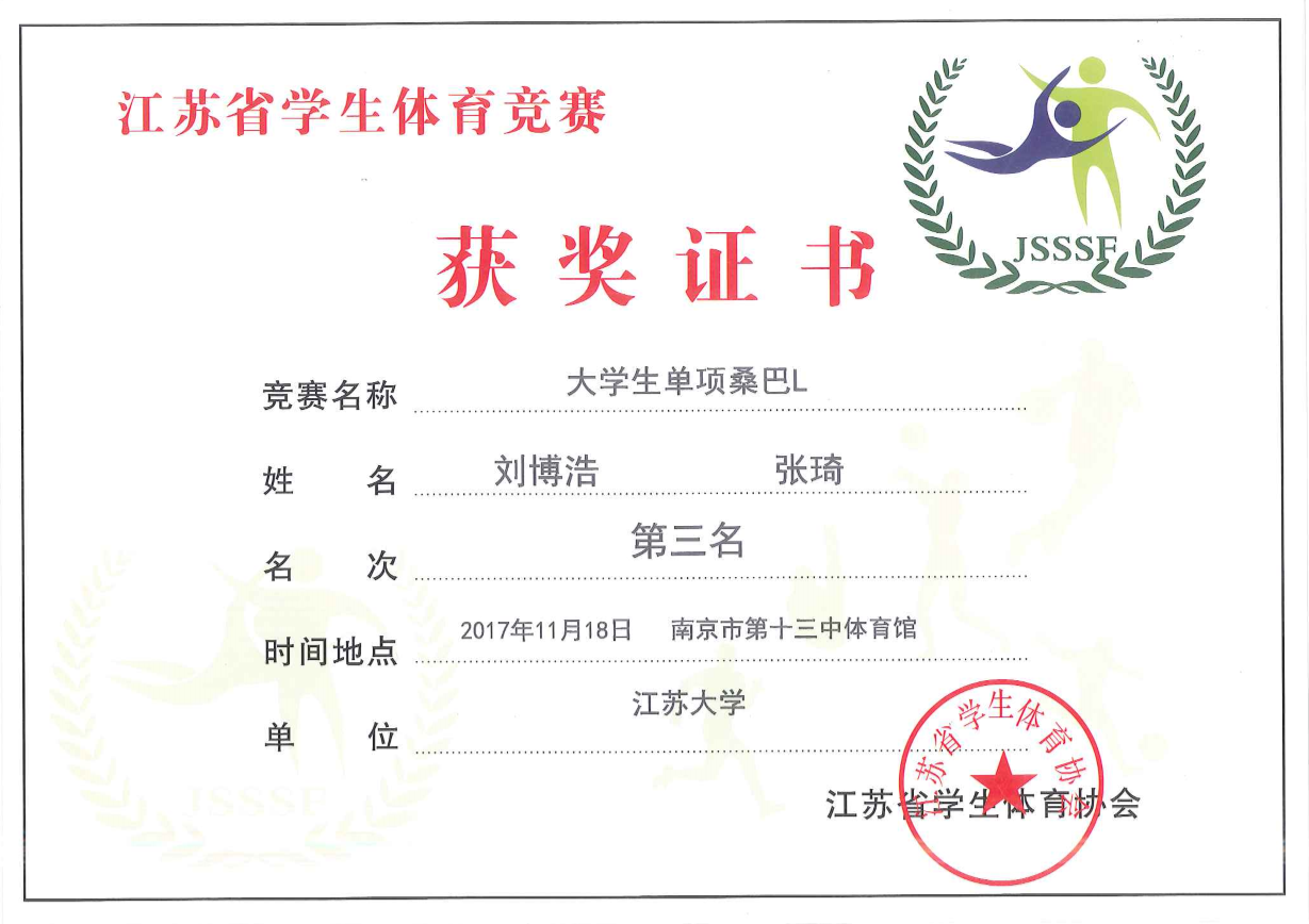 大学组双人单项牛仔第一名 大学组双人单项恰恰二等奖 大学组双人单项伦巴二等奖 大学组女子单人单项伦巴二等奖 大学组女子单人单项伦巴三等奖2项 大学组女子单人单项恰恰三等奖2项 团体总分三等奖 |