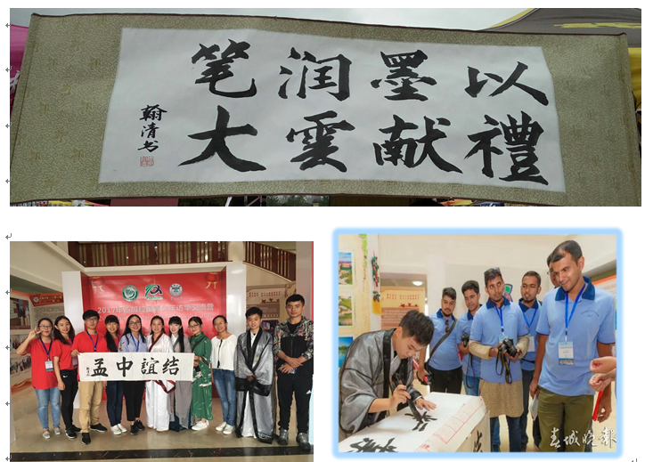 三、社团简介及品牌活动 (一)社团历史简介 云南大学书画协会于2004年成立,是一个以书画学习交流为主要活动内容的文化类学生社团。协会以传承文化,服务同学为核心,以“志于道、据于德、依于人、游于艺”为宗旨,以“书写青春、画意人生”为口号,为云南大学爱好书画的同学提供一个学习和交流的平台。协会自成立以来,始终坚持每周的常规活动,不断提高社员的临摹创作水平,并不定期举办全校范围内的大型活动,让更多的同学认识书画协会,了解中国的书画艺术,沉迷于中国字画的魅力中。 (二)特色活动介绍 1、笔墨漫谈-国画鉴赏—赵占东先生国画讲座 赵占东先生是中国美术家协会成员,国家民族画院副院长。通过组织开展专业的讲座,使热爱书画的学子对书画鉴赏能力、国画知识的进一步提升,增强了书画协会对在校学子的吸引力、凝聚力。 2、接待巴基斯坦、孟加拉国友人 2017年,巴基斯坦优秀青年代表和孟加拉国青少年交流营到访云南大学,书协配合校团委接待外国友人,组织开展弘扬中华传统文化,教授外国友人学习书画的中华文化体验活动,促进国际交流。 3、“深山老林古茶”杯书画篆刻大赛 该活动由书协主办,面向云南省在校大学生及研究生,邀请省内书画界名家大师进行现场指导和现场评审。 4、云南省高校社团风采大赛 2017年,书协参加云南高校社团风采大赛中获得“优秀奖”。协会成员展示了深厚的民族书法文化,并通过现场书写作画,让广大学子更加了解中华的传统书画文化和学习要领,在增强青年学子对国家的文化自信方面起到不可替代的作用。 5、送春联—社团特色精品活动 新春前夕,书协为全校师生现场书写新春对联,赢得了全校师生高度肯定与赞扬,在弘扬中华传统文化、增加青年对民族风俗的认识上做出了力所能及的努力。 6、东陆巡礼 书协积极参与由校团委发起的云南大学东陆巡礼暨社团文化博览会。通过联合琴棋书画等传统文化社团现场展示古韵表演《青花瓷》,向广大师生传递了中华民族浓厚的文化底蕴,增添了学习书画的热情。 7、 云大传播周——‘说说我的云大’之学子书画活动 书画协会参与主办“学子书画”活动,向云南省广大社团和全校师生募集作品百余幅,现场向广大师生教习书画。
