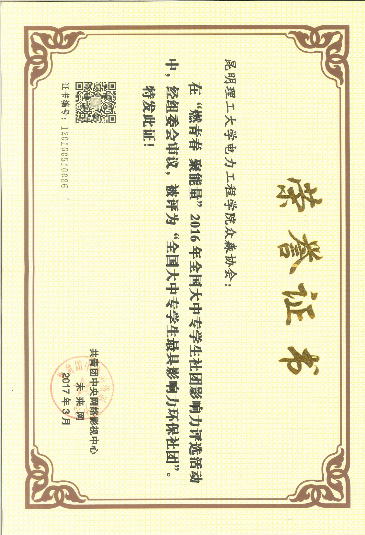 (2)2017年4月,众淼协会参与全国大中专学生社团影响力评选活动,在参选的全国6300家社团中脱颖而出,荣获“全国大中专学生最具影响力环保社团奖”。