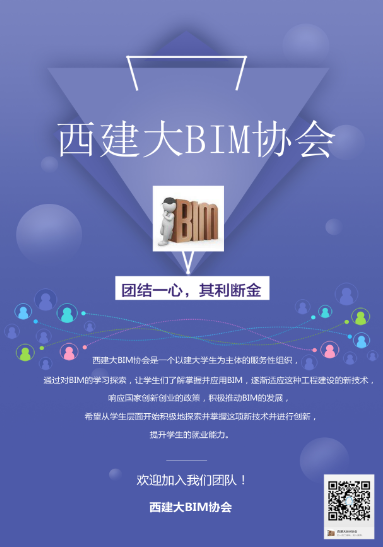 西建大BIM协会是一个以建大学生为主体的服务性组织,通过对BIM的学习探索,让学生们了解掌握并应用BIM,逐渐适应这种工程建设的新技术,响应国家创新创业的政策,积极推动BIM的发展,希望从学生层面开始积极地探索并掌握这项新技术并进行创新,提升学生的就业能力。协会宗旨:打造BIM团队,培养学生创新和创业兴趣,提升学生专业技能,培养BIM核心人才。
