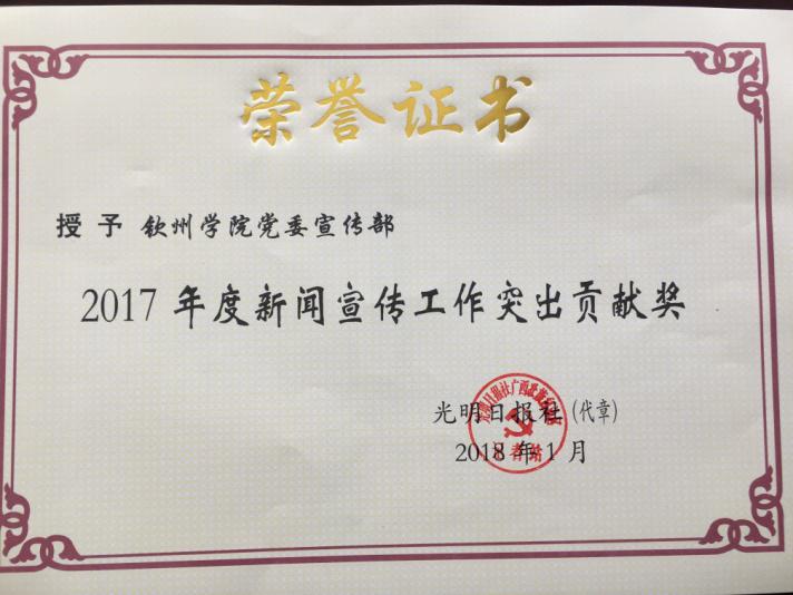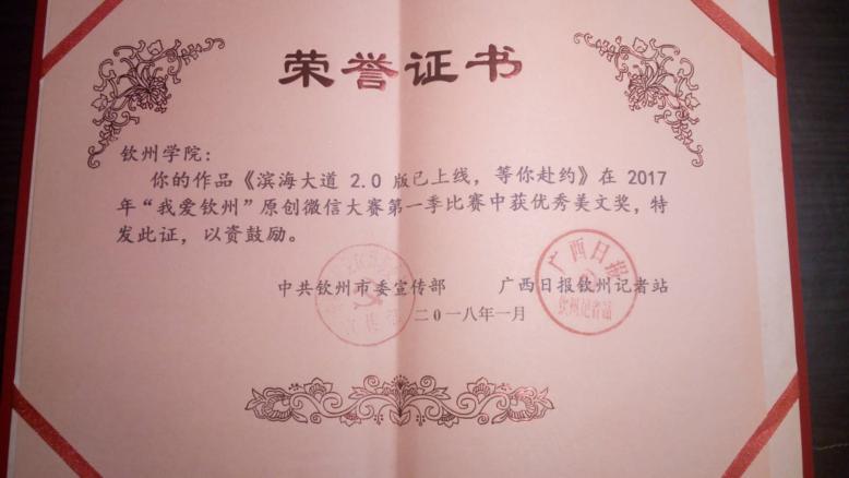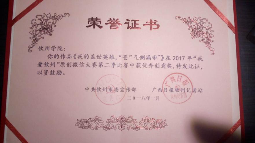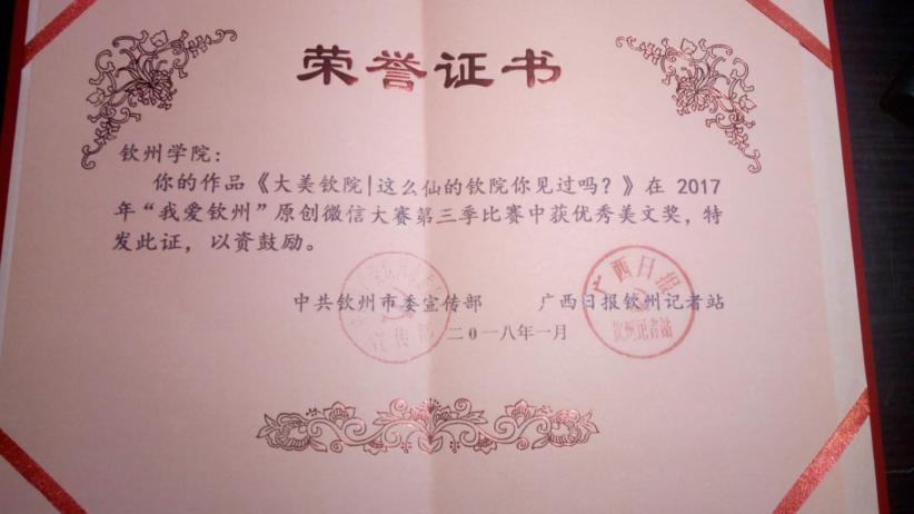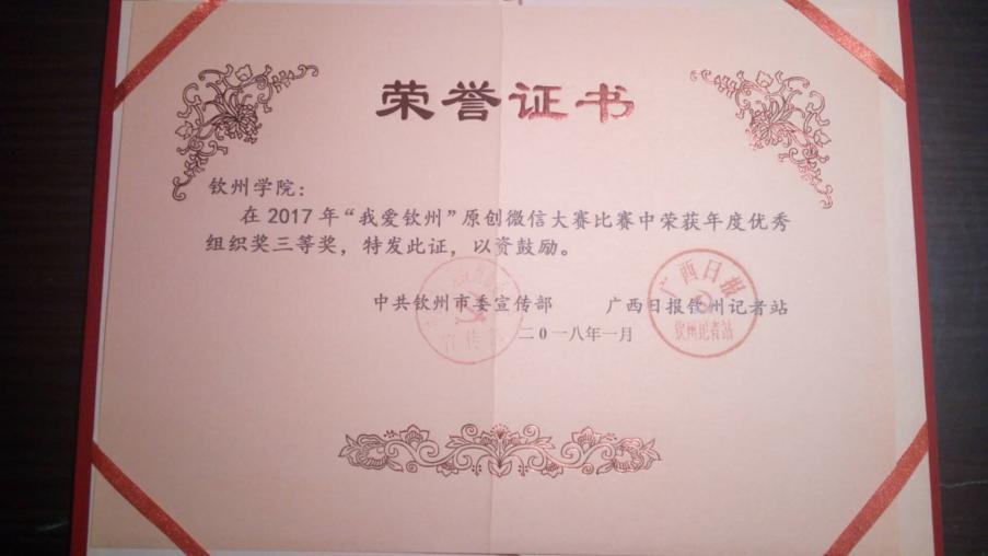 5.2017年“我爱钦州”原创微信大赛中荣获年度优秀组织奖三等奖。