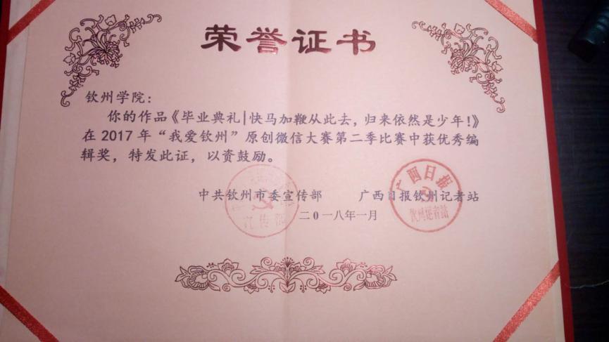 2.《毕业典礼|快马加鞭从此去,归来依然是少年!》获“我爱钦州”原创微信大赛第二季“优秀编辑奖”;