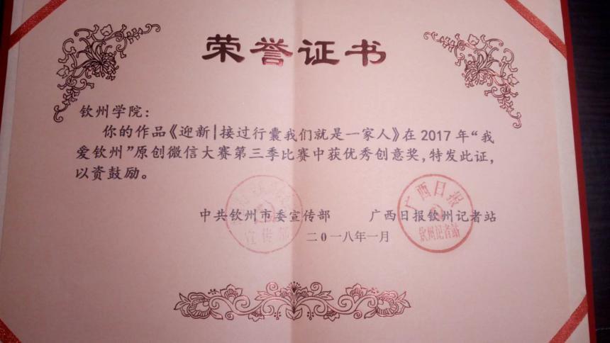 6.《迎新|接过行囊我们就是一家人》获得“我爱钦州”原创微信大赛第三季“优秀创意奖”;