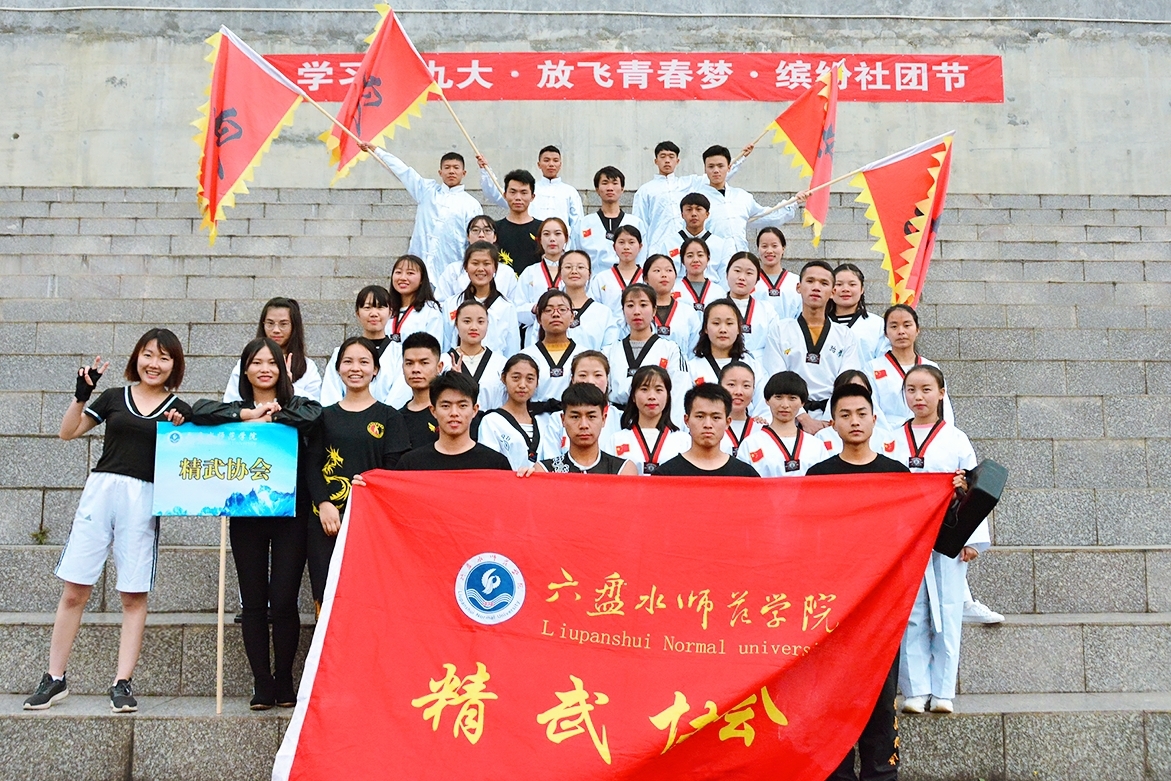 精武协会成立于2012年, 挂靠体育学院,受校团委、体育学院、学生社团联合会指导管理。是广大学生为弘扬武术精神、武术哲学思想以及武道功夫的六盘水师范学院唯一一家功夫社团。目前开设有:双截棍、传统武术(刀、剑、长棍、短棍、大旗、拳术等)、跆拳道、散打,目前协会有普通成员两百余人,会员一百余人。“精武”:“精”寓意精神、精彩、精通等;“武”寓意武术、奋斗、拼搏、止戈等。“精武”代表着一种世界观。本协会以武术为核心,大力弘扬武术精神、武术思想以及武道功夫。 协会有这样一句警言:“一滴汗水一份功,日久不练终成空”。协会每周训练时间达20小时,并与体育学院共同创建运动队,以培养在校爱好武术、跆拳道的学子去参加大学生运动会项目赛事。我们以武会友,以德服人。我们的口号是:文通武备、勤学苦练。吾之所向,一往无前。协会的宗旨:以健身为目的,大力弘扬武术精神和武术道德思想,丰富校园文化生活,促进校园文明建设,做文武全才的当代大学生。协会开展的主要活动:1.每年清明野炊拉练(已办六届) 2.每年12月协会综合武功晚会展示(已办六届) 3.敬老院、孤儿院公益表演(每年四次)