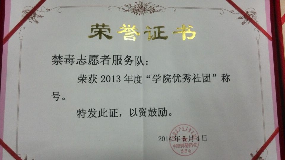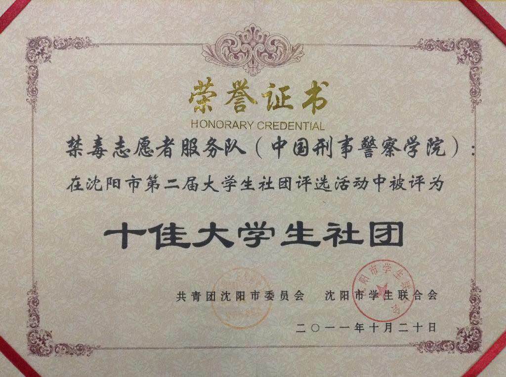 禁毒宣传志愿者服务队在2011年的沈阳高校十佳社团评选中脱颖而出,凭借独特的专业方向优势,以及每次活动的绩效和影响,使得禁毒宣传志愿者服务队荣获“沈阳市十佳社团”的特等殊荣。每次实践活动都受到广泛关注和好评也曾获得沈阳市暑期实践优秀社团。在以后的几年中又获得了学院的十佳社团等荣誉称号。