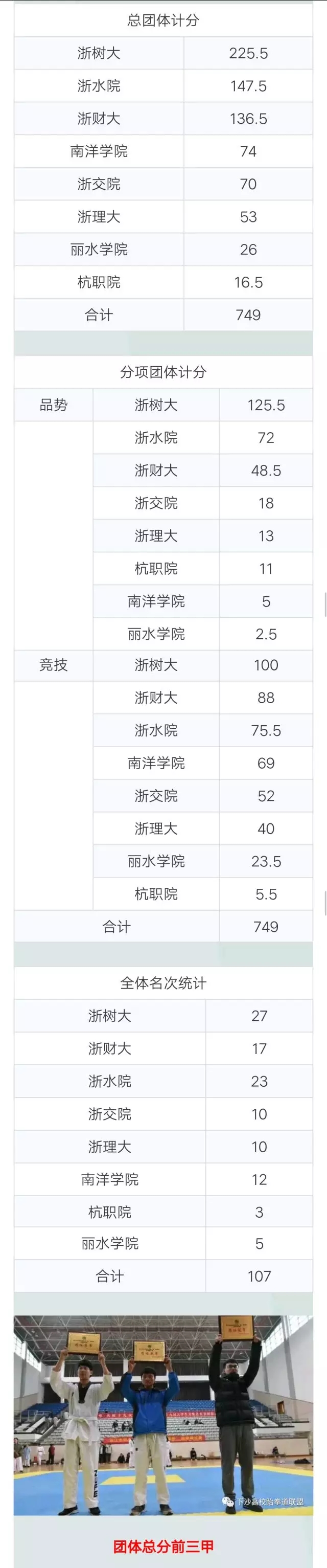 获得团体总分第二、竞技团体季军、品势团体亚军