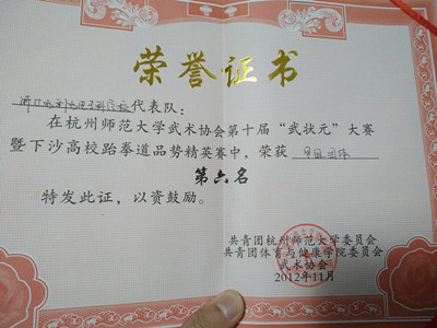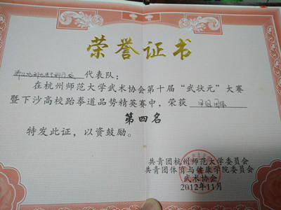 3. 杭州师范大学武术协会第十届“武状元”大赛暨下沙跆拳道联盟精英赛中,荣获甲组团体第四名和第六名
