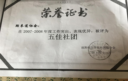 本社团秉承"推广跆拳道运动,宏扬跆拳道精神,提高大学生体质,丰富大学生生活"的宗旨,通过组织会员进行跆拳道训练,以达到强身健体,磨练意志,完善人格的目的。曾多次荣获沈阳市“十佳社团”称号;沈阳化工大学“五星”社团称号;沈阳化工大学“十佳社团”称号等。