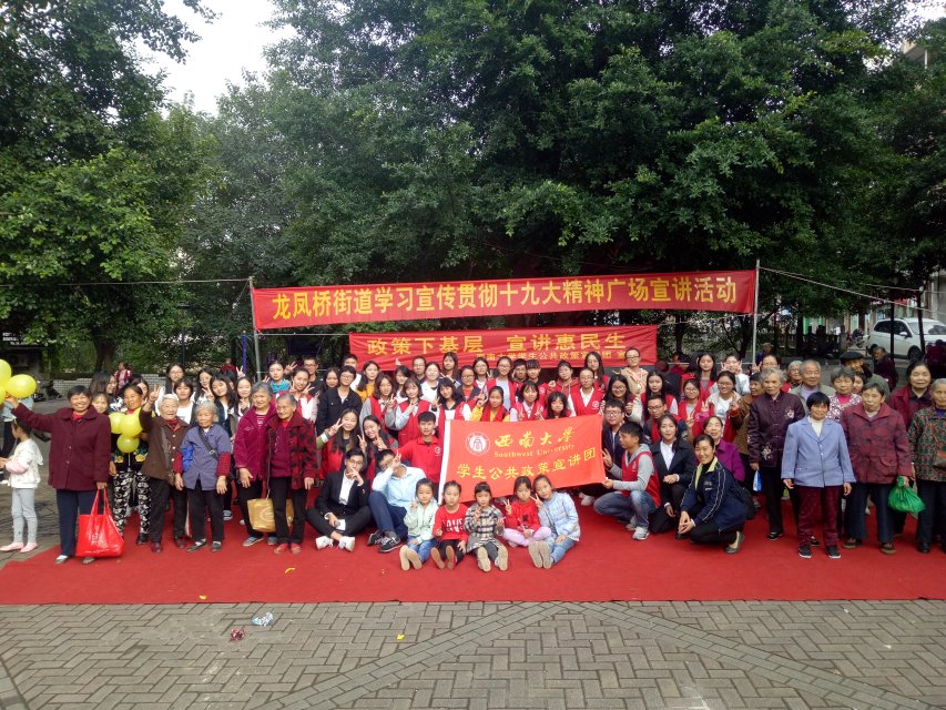 西南大学学生公共政策宣讲团自成立以来,坚持“面向基层,服务群众,解疑释惑,凝聚力量”的社团宗旨,以“政策下基层,宣讲惠民生”为初衷,围绕建设理论学习和调研宣讲的“两型社团”的目标,促进国家公共政策在基层的理解与执行,积极发扬当代大学生的社会责任感。成立以来,组织开展了以下活动: