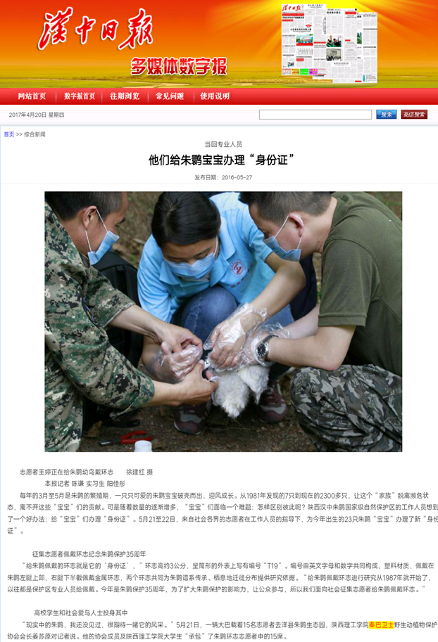 2016年5月,协会前往汉中洋县朱鹮国家级自然保护区,为新出生的20多只朱鹮幼鸟带上环志。汉中日报社等多家媒体对此活动做了详细深入的报道,引起了良好的社会反响。