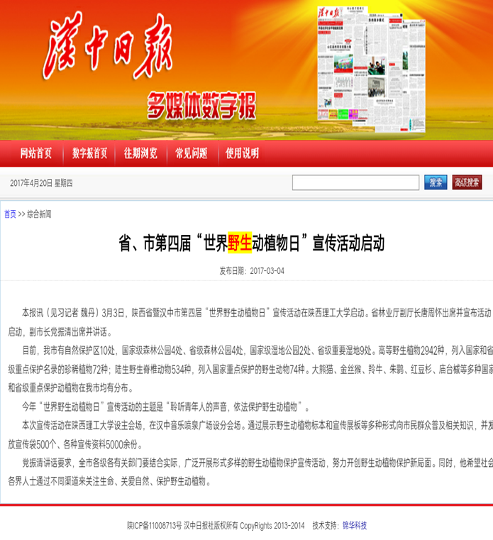 2017年3月,陕西省暨汉中市第四届世界野生动植物保护日宣传活动启动仪式在我校举行,副校长为活动致辞。协会积极响应号召,通过动植物标本展览,签名动员,科普读物发放等活动激发同学们保护动植物的意识,取得了良好的影响力。
