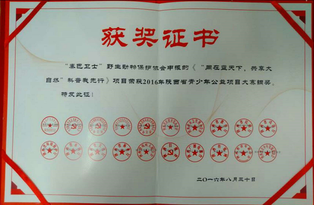 《“青山绿水”绿色护卫者社会实践服务团》获得陕西理工大学首届环保创意大赛二等奖。协会申报的“同在蓝天下,共享大自然”绿色护卫队,荣获陕西省第七届环保创意大赛二等奖。协会申报的《“同在蓝天下,共享大自然”科普我先行》项目荣获陕西省青少年公益项目大赛铜奖。