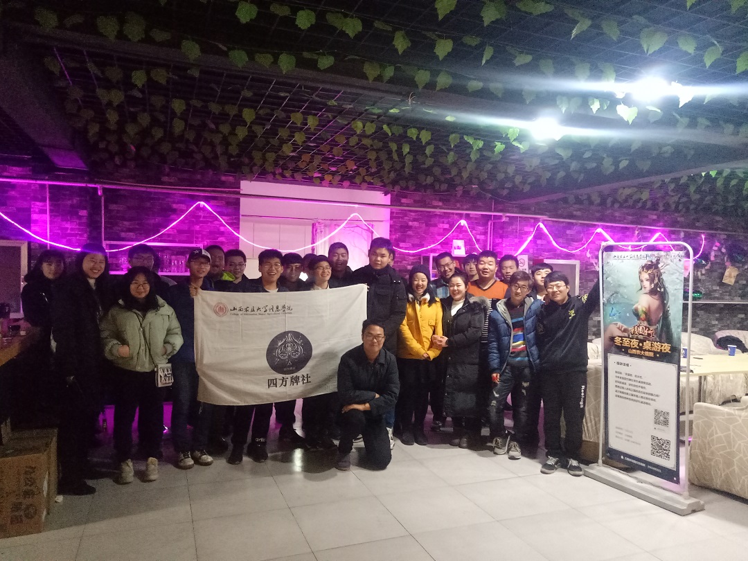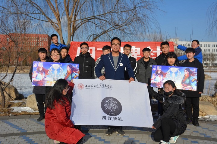 山西农业大学信息学院四方牌社成立于2014年10月,属于我校学术类社团,由校团委直接指导,是学校最具影响力的社团之一。社团致力于益智游戏、脑力游戏的发展,尤其是丰富广大师生的课外生活培养生活的乐趣,让同学们在忙碌的生活中从桌游中感受轻松、体会快乐。告别冰冷的屏幕,回归桌面的温暖。