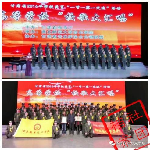 因为在甘肃省学校美育“一节一赛一交流”活动中一举摘得“优秀表演奖”(非专业组)、“最佳团队奖”两项殊荣,2016年12月25日,胡杨国旗护卫队代表学院赴兰参加甘肃省高等学校“校歌大汇唱”展演活动,得与西北师范大学等优秀团队同台献艺,并以良好的精神面貌和演唱效果得到评委老师及现场观众高度赞扬。
