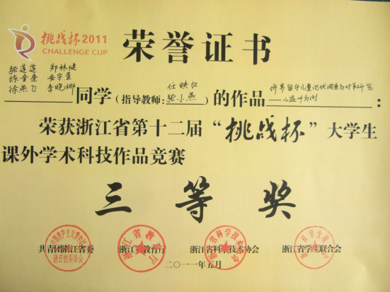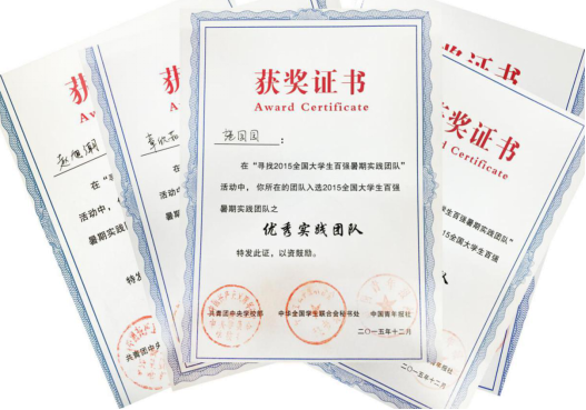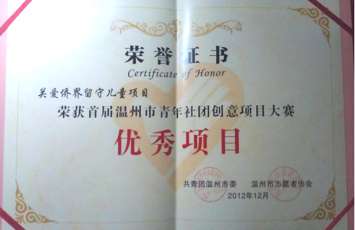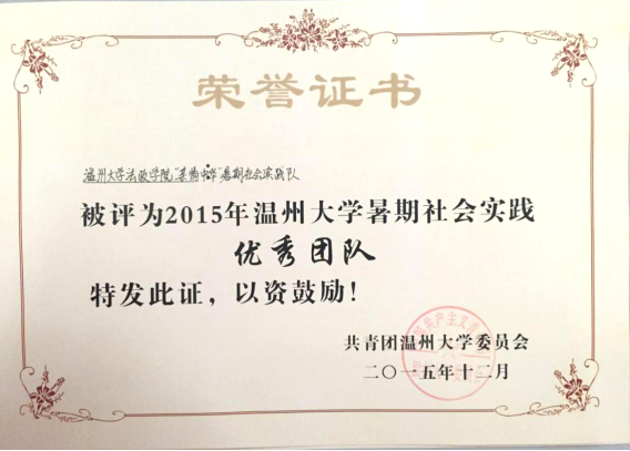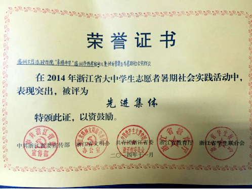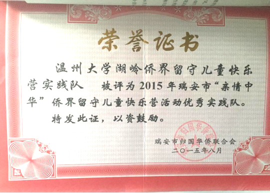 ★2014年,“亲情中华”温州市侨界留守儿童快乐营暑期社会实践队获得浙江省大中学生暑期社会实践优秀团队称号