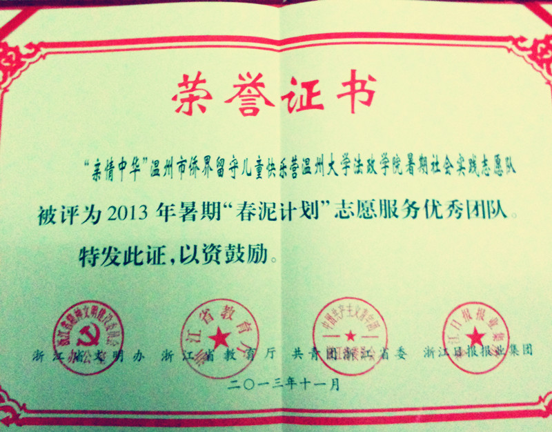 ★2013年,“亲情中华”温州市侨界留守儿童快乐营暑期社会实践志愿队被评为“春泥计划”志愿服务优秀团队